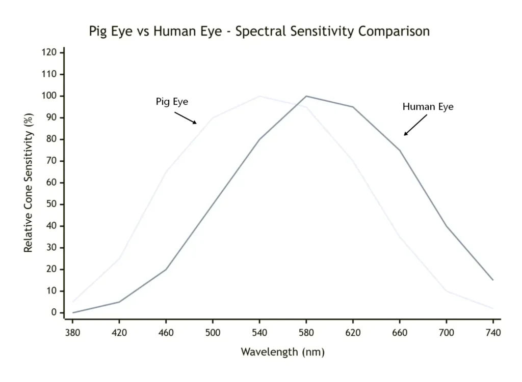 This means pigs perceive less red light but more contrast in green-blue tones.