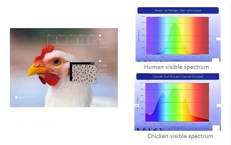 Poultry see light differently from humans — they can detect ultraviolet wavelengths and notice flicker that humans cannot.