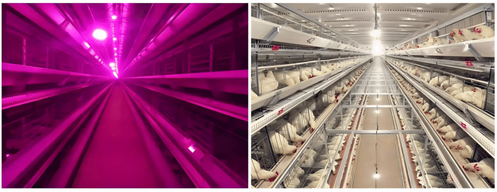Light spectrum, brightness, and flicker level all influence how birds behave. That’s why chicken houses should use professional poultry lights, not normal indoor tubes.